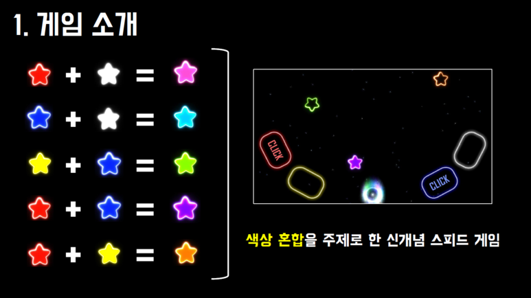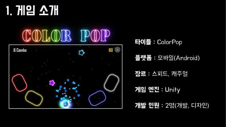 #색상 #혼합 #스피드게임 #순발력 #컬러팝 # ColorPop 시시한 스피드 게임은 가라! 이젠 뇌까지 빠르게 굴려야 하는 ColorPop을 만나볼 시간 다양한 색의 조합을 빠르게 맞춰서 별들이 블랙홀에 빠지지 않도록 하세요 당신의 순발력의 한계를 경험할 기회! ColorPop은 색상 혼합을 주제로 한 신개념 스피드 게임입니다. 4개의 색 버튼을 사용하여 다양한 색의 조합을 빠르게 맞혀 별들이 블랙홀에 빠지지 않도록 하세요! 틀리지 않고 콤보를 오래