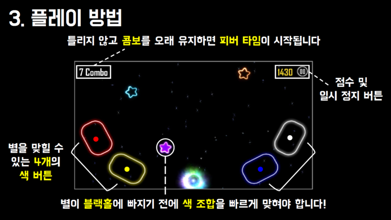 다양한 색의 조합을 빠르게 눌러 별들이 블랙홀에 빠지지 않도록 하세요