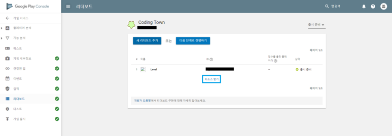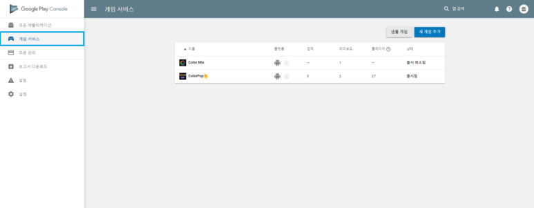 구글 플레이 콘솔창에서 게임서비스 탭으로 들어갑니다.