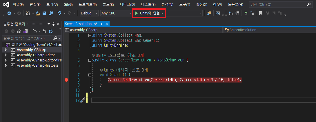 Visual Studio를 실행한 후, 상단에 'Unity에 연결' 버튼을 클릭합니다.