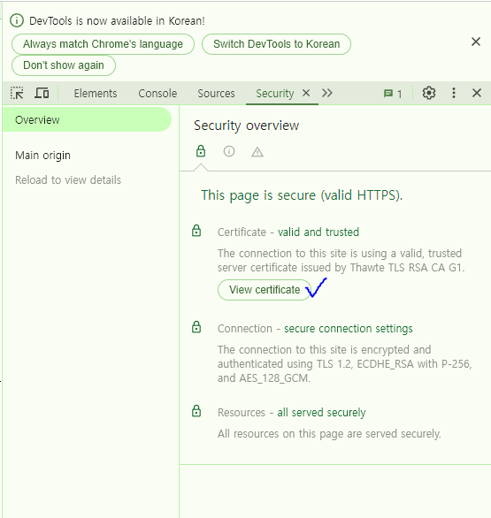 Chrome의 경우 해당 사이트에서 F12(Dev tool)을 누른 후 Security 탭에서 확인 가능하다