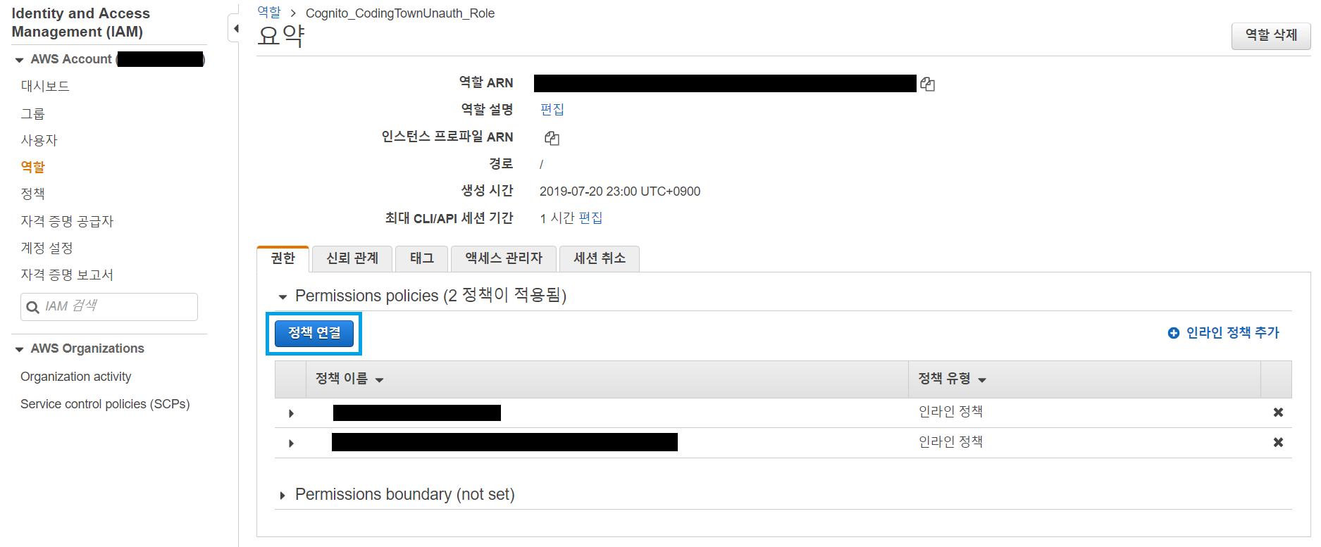 이 중에서 Cognito_(자격 증명 풀이름)Unauth_Role 역할을 클릭한다.