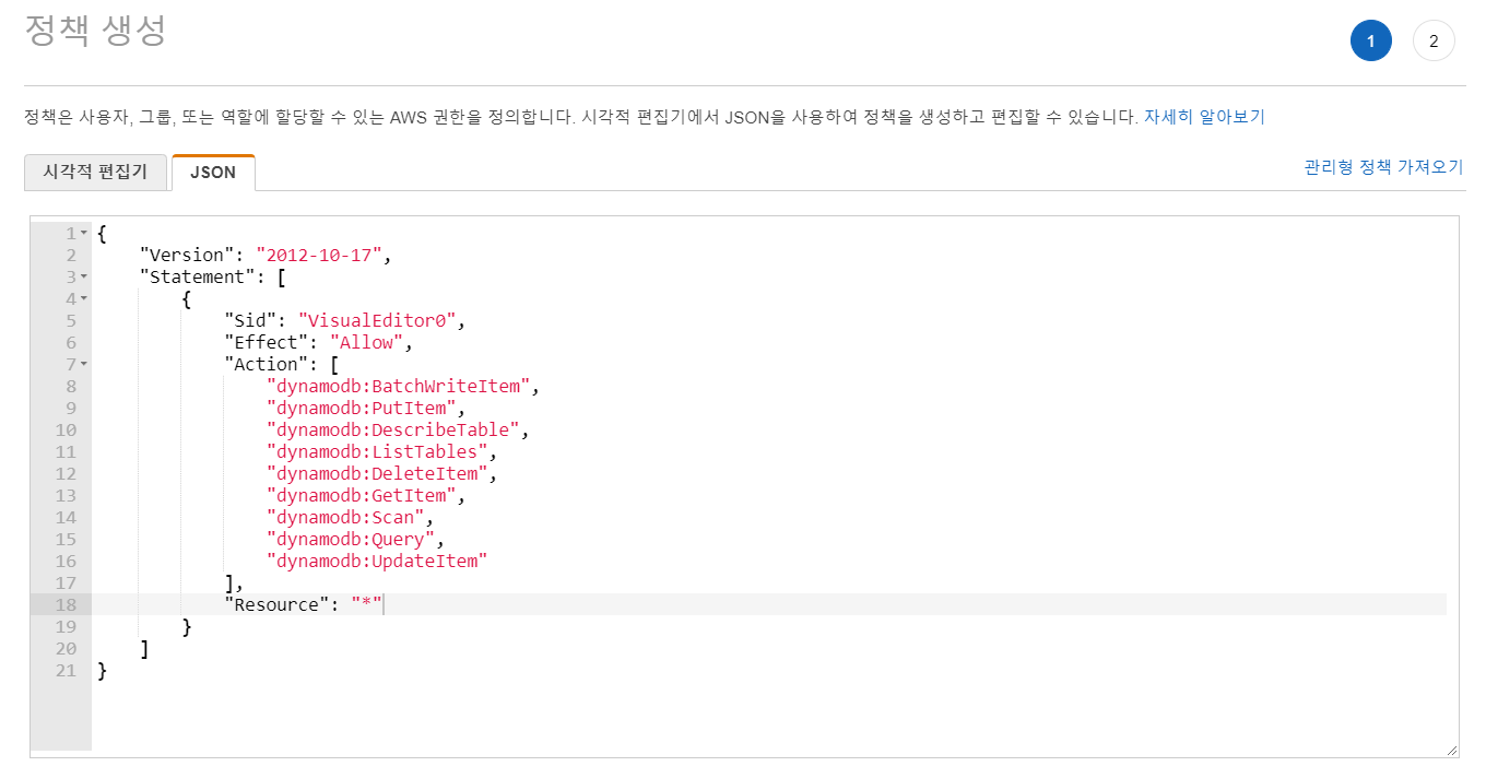 dynamoDB 접근 권한을 위해 JSON 파일을 작성한다.