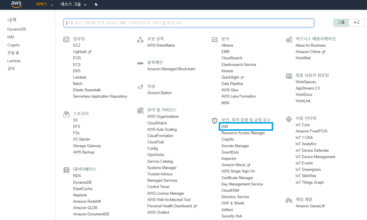 그 다음, DynamoDB 접근 권한 설정을 위해 IAM 콘솔 창으로 접속한다.