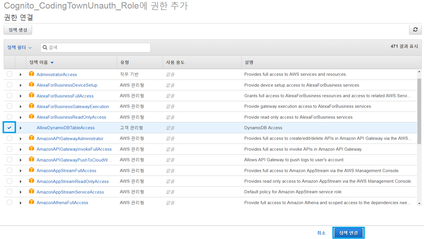 방금 생성한 정책을 체크한 뒤 '정책 연결'을 클릭한다.