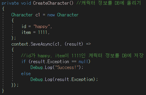 CreateCharacter 함수를 실행시키면, id를 happy, item을 1111을 갖는 캐릭터 c1이 DB에 저장된다.