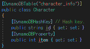 [DynamoDBTable("테이블 이름")] 을 통해 테이블을 선언할 수 있다.