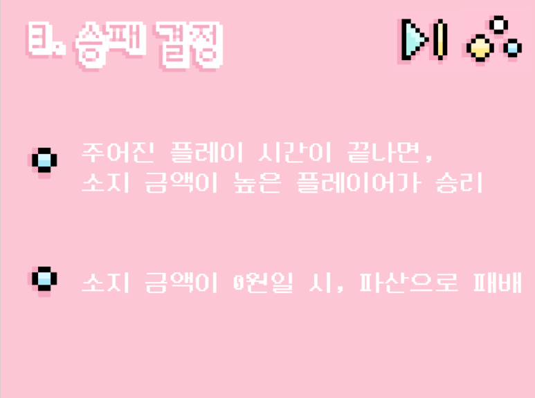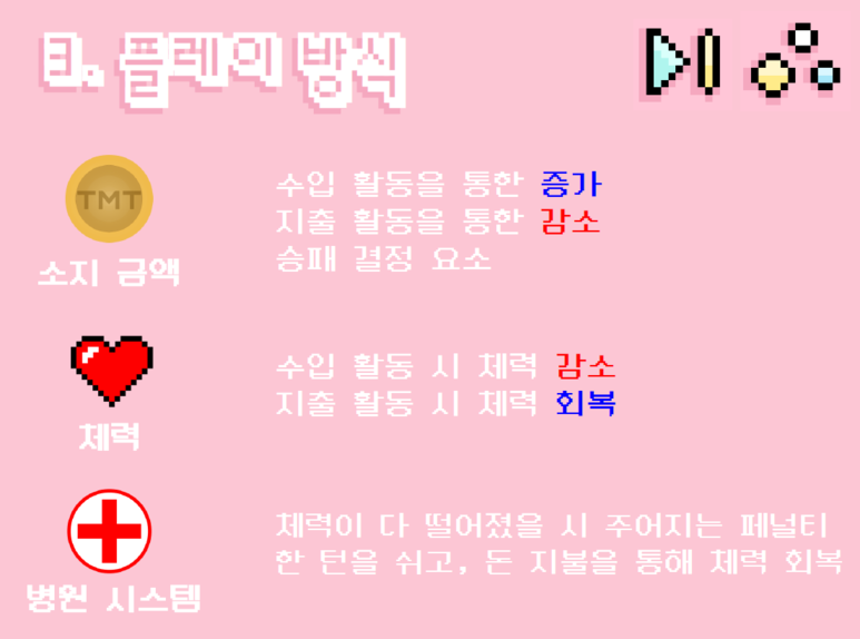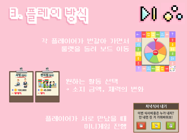 TMT(티끌 모아 태산) 온라인 보드게임과 대학생의 소비 생활이 만났다! 당신의 숨겨진 절약정신을 드러내세요 - 원하는 플레이어와 멀티 플레이가 가능한 룸 시스템 - 사용자의 취향을 고려한 닉네임, 캐릭터 선택 시스템 - 다양한 소비 & 수입 이벤트 선택 가능